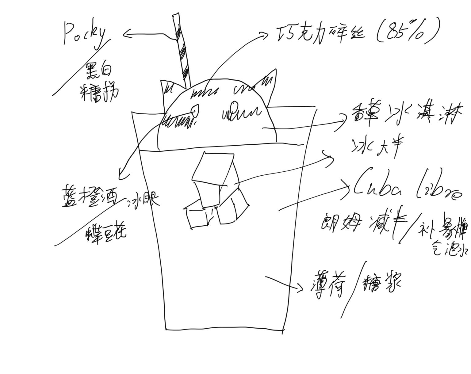 给宝设计的鸡尾酒 设计 酒:Cuba Libre 朗姆酒减半,青柠汁少许 补少许薄荷糖浆 冰淇淋 主体:香草冰淇淋打底,用猫咪模具塑形,做出耳朵形状,有猫爪模具更好。间隔淋巧克力酱 尾巴:黑白相间的饼干作尾巴,弯曲的长条状最好 眼睛:蓝柑糖浆+吉利丁或蝶豆花浸泡过的无色基酒